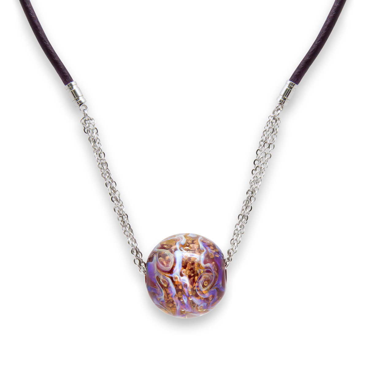 Колье изготовлено из натуральной кожи, муранского стекла и гипоаллергенной ювелирной стали, что очень важно для людей с чувствительной кожей. Металл не темнеет и не подвергается воздействиям окружающей среды, надолго обеспечивая красивый внешний вид изделия. Длина колье - 46 см + 5 см. удлиняющая цепочка. Диаметр стеклянного шара - 2,5 см. Вес - 29 гр.