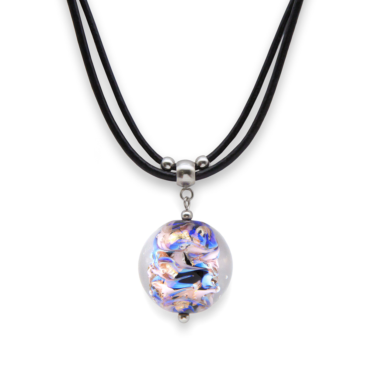 Колье изготовлено из натуральной кожи, муранского стекла и гипоаллергенной ювелирной стали, что очень важно для людей с чувствительной кожей. Металл не темнеет и не подвергается воздействиям окружающей среды, надолго обеспечивая красивый внешний вид изделия. Длина колье - 46 см + 5 см. удлиняющая цепочка. Диаметр стеклянного шара - 2,3 см. Вес - 23 гр.