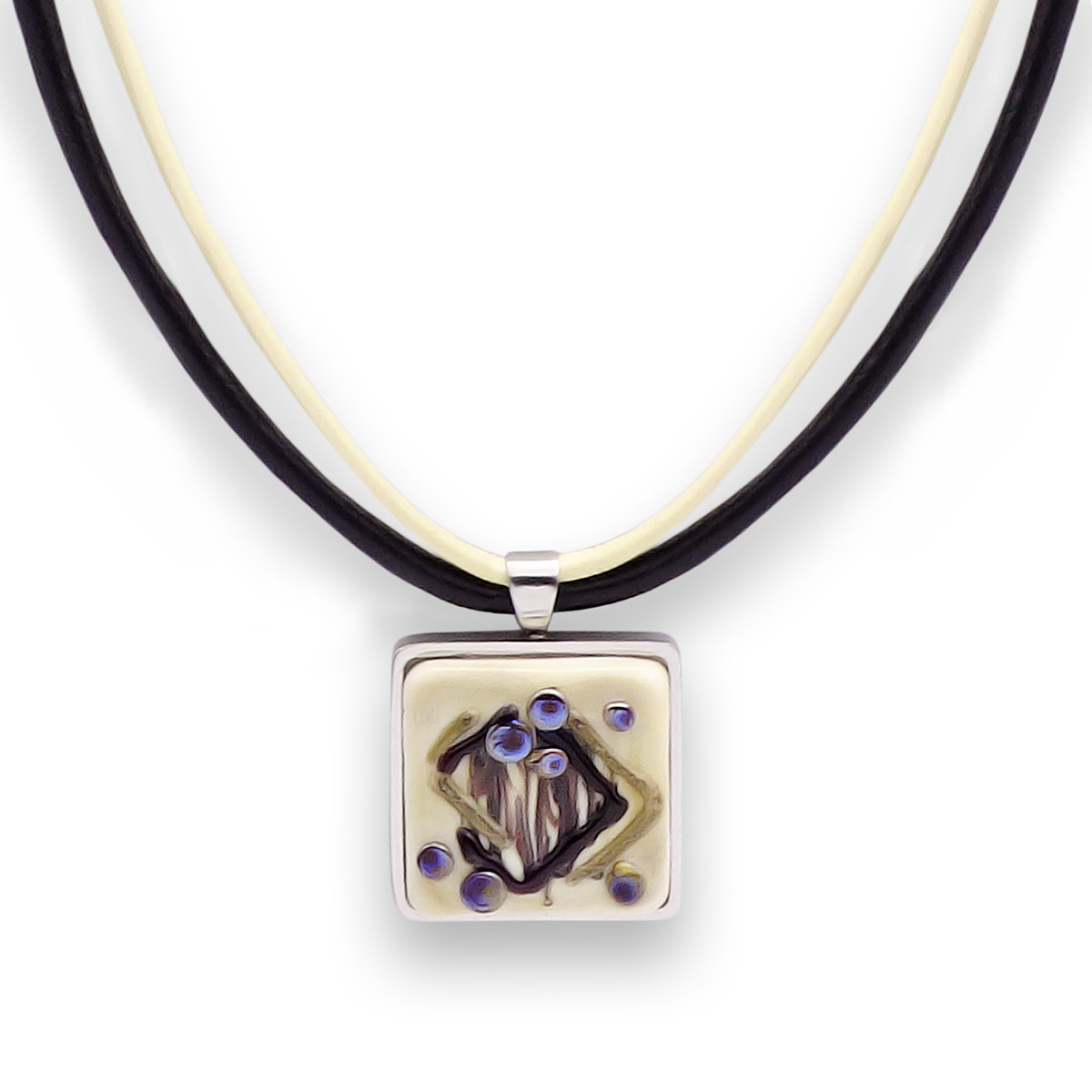 Колье изготовлено из натуральной кожи, муранского стекла и гипоаллергенной ювелирной стали, что очень важно для людей с чувствительной кожей. Металл не темнеет и не подвергается воздействиям окружающей среды, надолго обеспечивая красивый внешний вид изделия. Длина колье - 46 см + 5 см. удлиняющая цепочка. Размер стеклянного элемента - 2,2х2,2 см. Вес - 21 гр.
