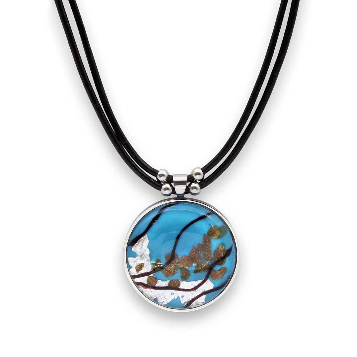 Колье изготовлено из натуральной кожи, муранского стекла и гипоаллергенной ювелирной стали, что очень важно для людей с чувствительной кожей. Металл не темнеет и не подвергается воздействиям окружающей среды, надолго обеспечивая красивый внешний вид изделия. Длина колье - 46 см + 5 см. удлиняющая цепочка. Диаметр стеклянного элемента - 3 см. Вес - 20 гр.