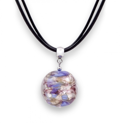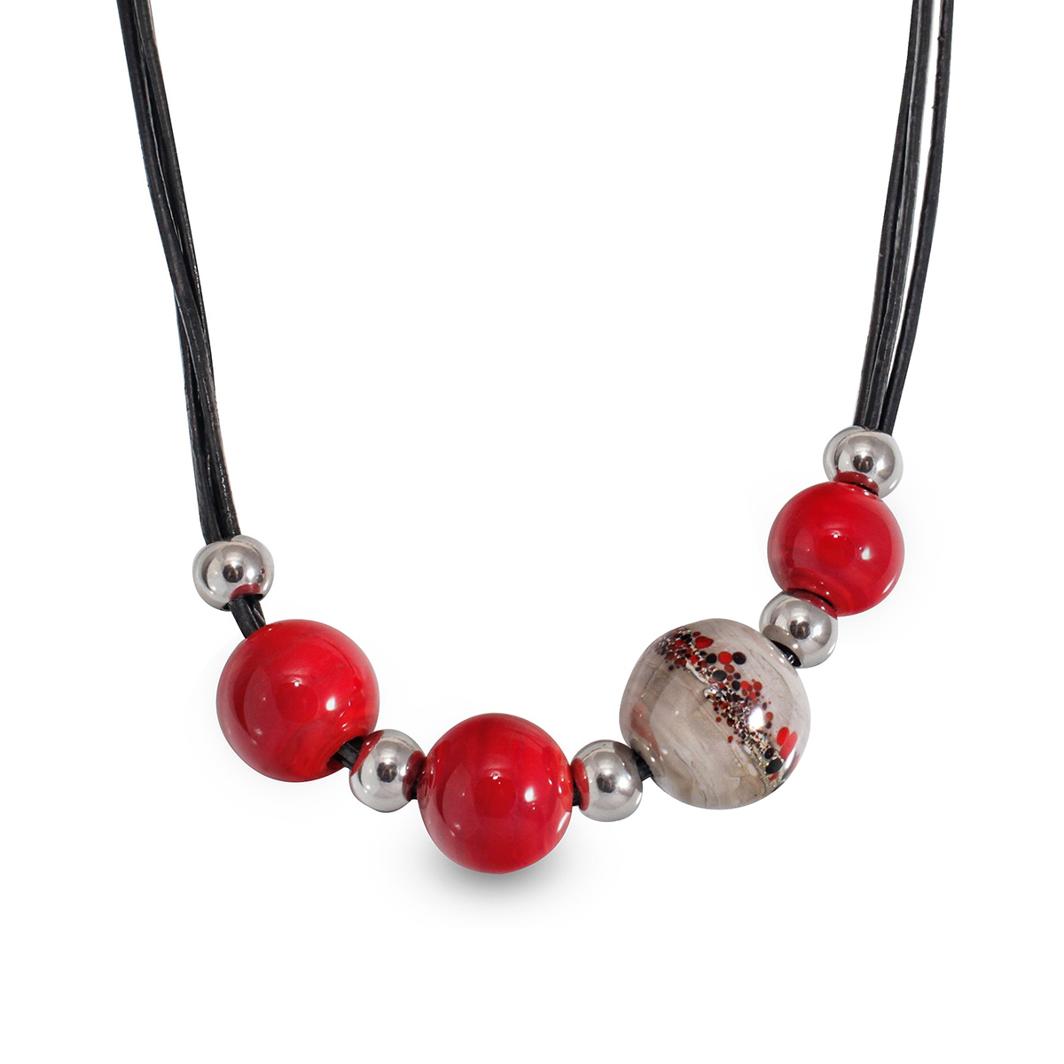 Колье изготовлено из натуральной кожи, муранского стекла и гипоаллергенной ювелирной стали, что очень важно для людей с чувствительной кожей. Металл не темнеет и не подвергается воздействиям окружающей среды, надолго обеспечивая красивый внешний вид изделия. Длина колье - 46 см + 5 см. удлиняющая цепочка. Диаметр стеклянных шаров - 1,5, 1,8 и 2,2 см. Вес - 55 гр.