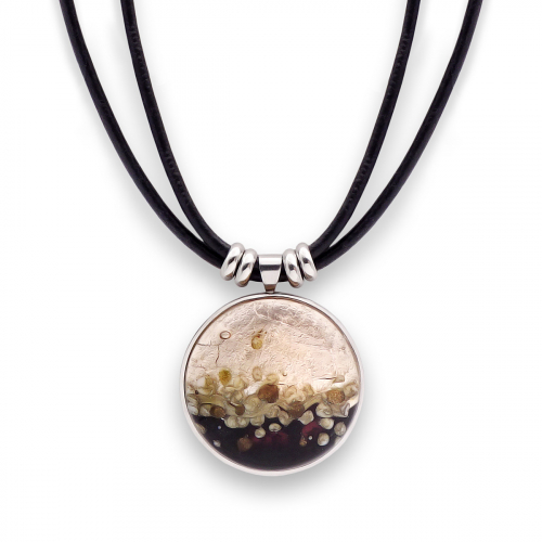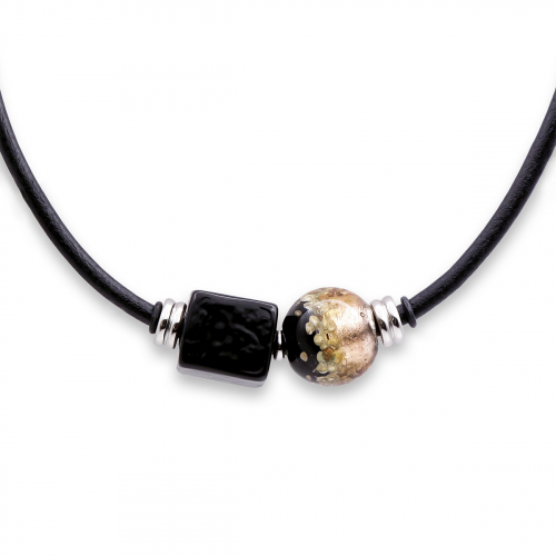 Колье изготовлено из натуральной кожи, муранского стекла и гипоаллергенной ювелирной стали, что очень важно для людей с чувствительной кожей. Металл не темнеет и не подвергается воздействиям окружающей среды, надолго обеспечивая красивый внешний вид изделия. Длина колье - 46 см + 5 см. удлиняющая цепочка. Диаметр стеклянного шара - 2,2 см.  Размер куба - 1,8х1,6 см. Вес - 40 гр.