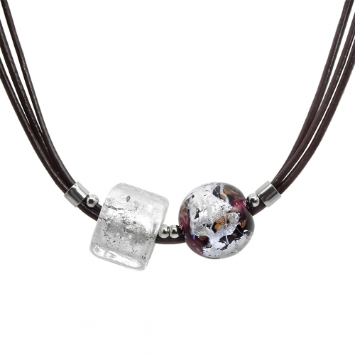 Браслет изготовлен из муранского стекла, натуральной кожи и гипоаллергенной ювелирной стали, что очень важно для людей с чувствительной кожей. Металл не темнеет и не подвергается воздействиям окружающей среды, надолго обеспечивая красивый внешний вид изделия. Длина колье - 46 см + 5 см. удлиняющая цепочка. Диаметр стеклянного шара - 2,2 см. Размер куба - 1,8х1,6 см. Вес - 36 гр.