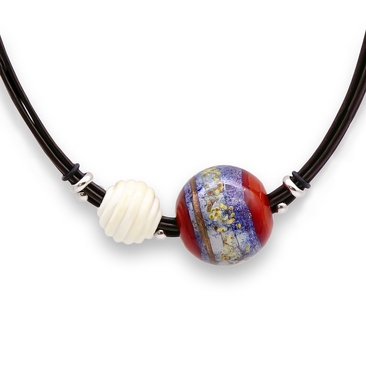 Колье изготовлено из натуральной кожи, муранского стекла и гипоаллергенной ювелирной стали, что очень важно для людей с чувствительной кожей. Металл не темнеет и не подвергается воздействиям окружающей среды, надолго обеспечивая красивый внешний вид изделия. Длина колье - 46 см + 5 см. удлиняющая цепочка. Диаметр стеклянных шаров - 1,5 и 2.5 см. Вес - 35 гр.