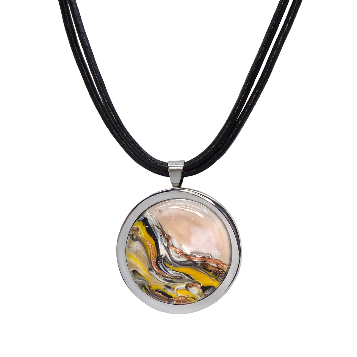 Колье изготовлено из натуральной кожи, муранского стекла и гипоаллергенной ювелирной стали, что очень важно для людей с чувствительной кожей. Металл не темнеет и не подвергается воздействиям окружающей среды, надолго обеспечивая красивый внешний вид изделия. Длина колье - 46 см + 5 см. удлиняющая цепочка. Диаметр стеклянного элемента - 2,5 см. Вес - 20 гр.