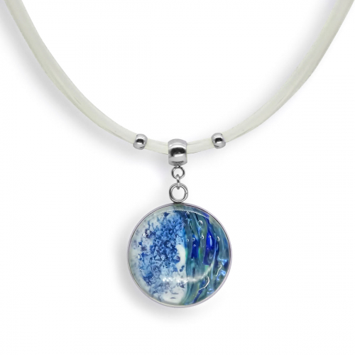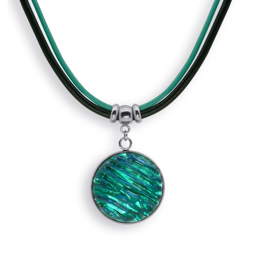 Колье изготовлено из натуральной кожи, муранского стекла и гипоаллергенной ювелирной стали, что очень важно для людей с чувствительной кожей. Металл не темнеет и не подвергается воздействиям окружающей среды, надолго обеспечивая красивый внешний вид изделия. Длина колье - 46 см + 5 см. удлиняющая цепочка. Диаметр стеклянного элемента - 2,5 см. Вес - 15 гр.