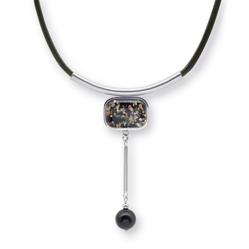 Колье изготовлено из натуральной кожи, муранского стекла и гипоаллергенной ювелирной стали, что очень важно для людей с чувствительной кожей. Металл не темнеет и не подвергается воздействиям окружающей среды, надолго обеспечивая красивый внешний вид изделия. Длина колье - 46 см + 5 см. удлиняющая цепочка. Диаметр стеклянного элемента - 2,5 см. Вес - 29 гр.