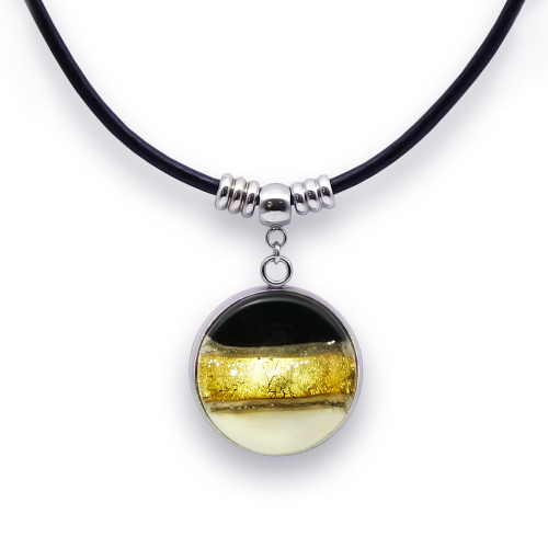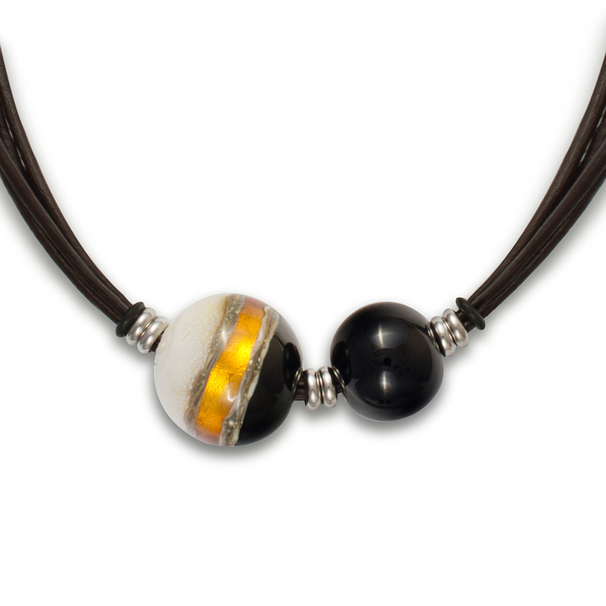 Колье изготовлено из натуральной кожи, муранского стекла и гипоаллергенной ювелирной стали, что очень важно для людей с чувствительной кожей. Металл не темнеет и не подвергается воздействиям окружающей среды, надолго обеспечивая красивый внешний вид изделия. Длина колье - 46 см + 5 см. удлиняющая цепочка. Диаметр стеклянных шаров - 1,8 и 2,5 см. Вес -  38 гр.