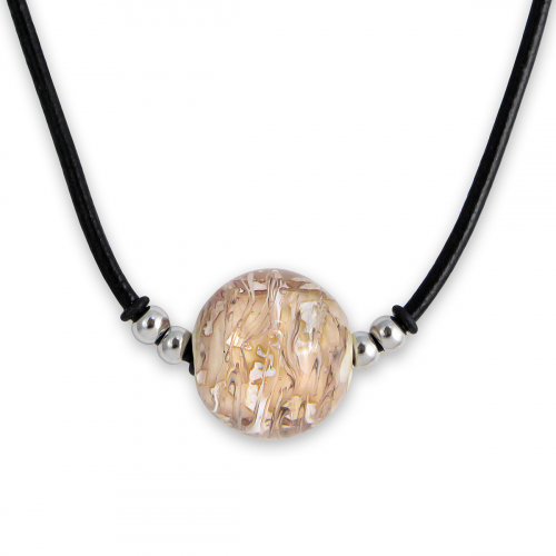 Колье изготовлено из натуральной кожи, муранского стекла и гипоаллергенной ювелирной стали, что очень важно для людей с чувствительной кожей. Металл не темнеет и не подвергается воздействиям окружающей среды, надолго обеспечивая красивый внешний вид изделия. Длина колье - 46 см + 5 см. удлиняющая цепочка. Диаметр стеклянного шара - 2,5 см. Вес - 28 гр.