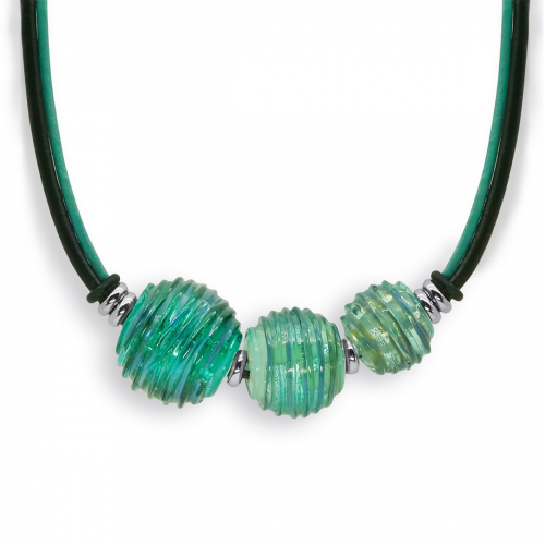 Колье изготовлено из натуральной кожи, муранского стекла и гипоаллергенной ювелирной стали, что очень важно для людей с чувствительной кожей. Металл не темнеет и не подвергается воздействиям окружающей среды, надолго обеспечивая красивый внешний вид изделия. Длина колье - 46 см + 5 см. удлиняющая цепочка. Диаметр стеклянного элемента - 2,5 см. Вес - 16 гр.