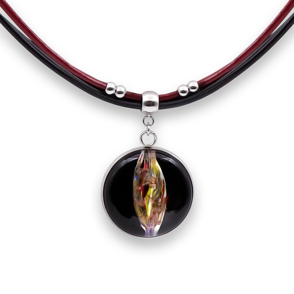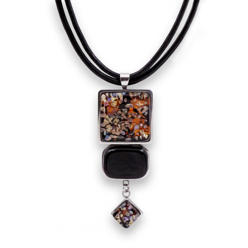 Колье изготовлено из натуральной кожи, муранского стекла и гипоаллергенной ювелирной стали, что очень важно для людей с чувствительной кожей. Металл не темнеет и не подвергается воздействиям окружающей среды, надолго обеспечивая красивый внешний вид изделия. Длина колье - 46 см + 5 см. удлиняющая цепочка. Диаметр стеклянного элемента - 2,5 см. Вес - 17 гр.