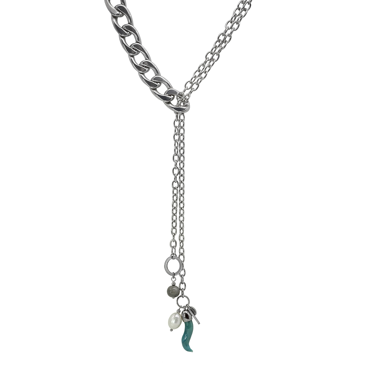 Колье изготовлено из муранского стекла и гипоаллергенной ювелирной стали, что очень важно для людей с чувствительной кожей. Металл не темнеет и не подвергается воздействиям окружающей среды, надолго обеспечивая красивый внешний вид изделия. Длина колье - 53 см + 5 см. удлиняющая цепочка. Длина подвески - 3,5 см. Вес - 89 гр.