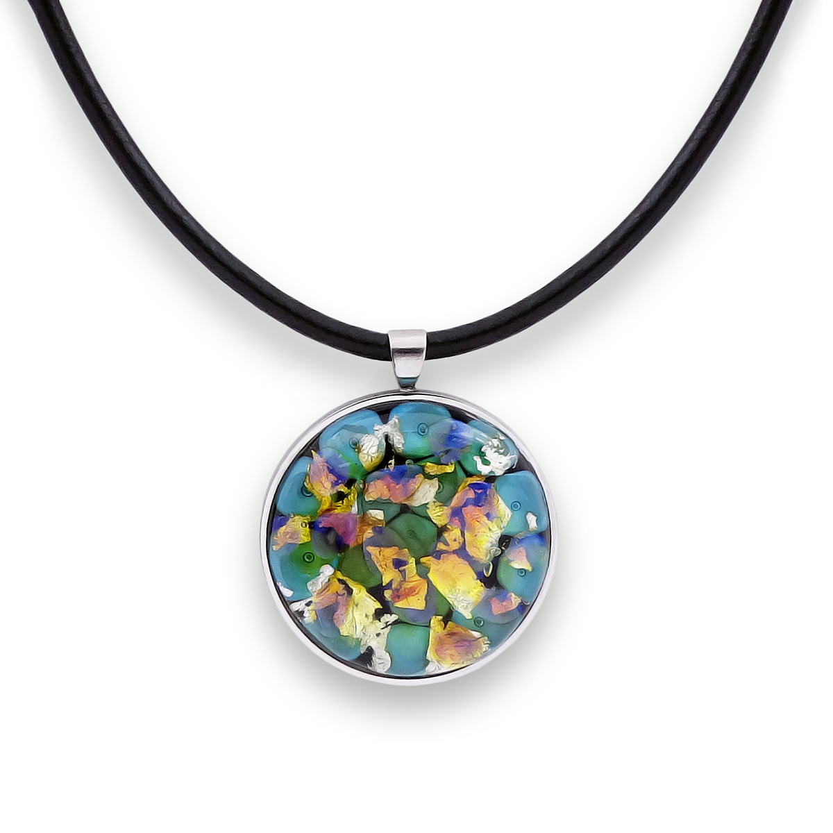 Колье изготовлено из натуральной кожи, муранского стекла и гипоаллергенной ювелирной стали, что очень важно для людей с чувствительной кожей. Металл не темнеет и не подвергается воздействиям окружающей среды, надолго обеспечивая красивый внешний вид изделия. Длина колье - 46 см + 5 см. удлиняющая цепочка. Диаметр стеклянного элемента - 3 см. Вес - 22 гр.