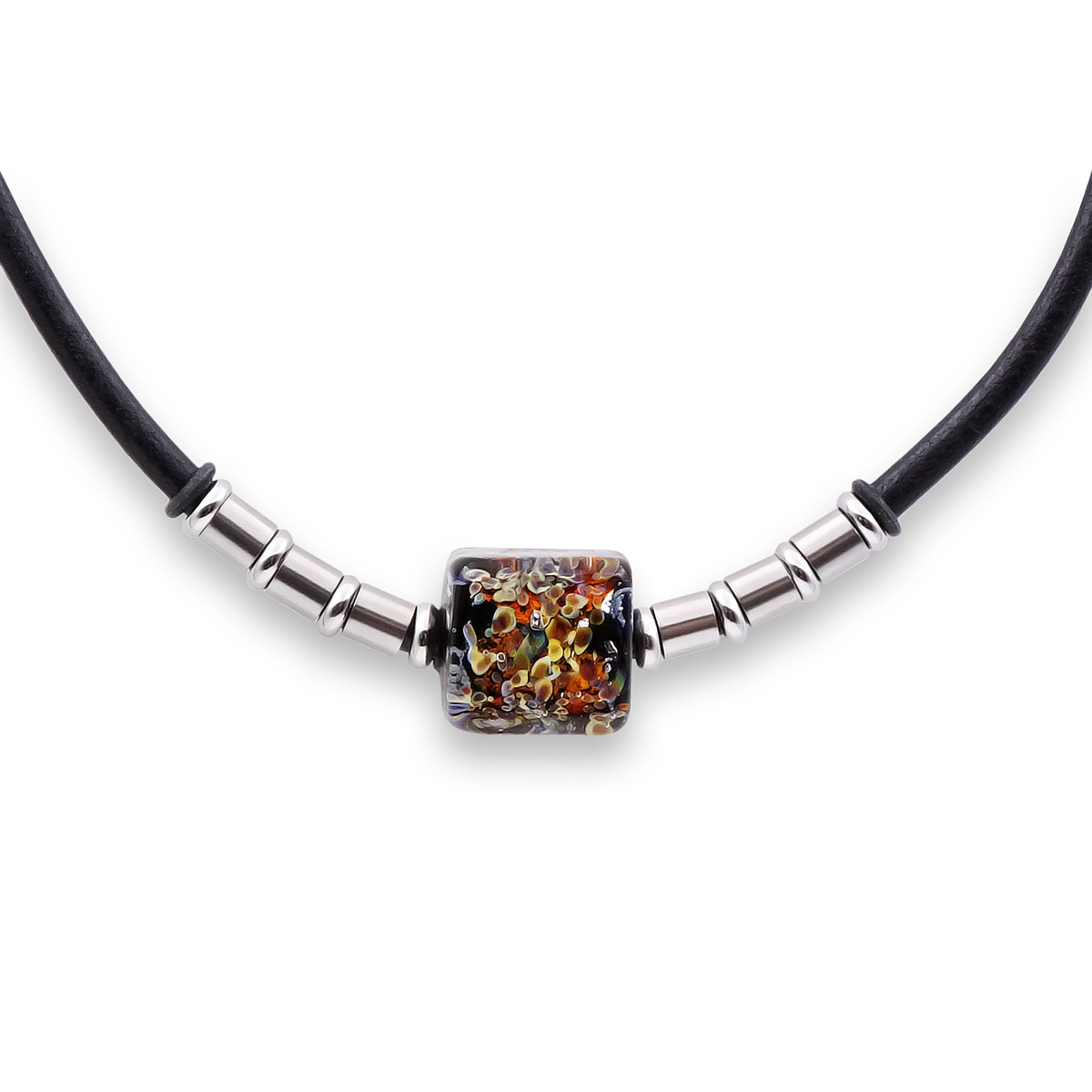 Колье изготовлено из натуральной кожи, муранского стекла и гипоаллергенной ювелирной стали, что очень важно для людей с чувствительной кожей. Металл не темнеет и не подвергается воздействиям окружающей среды, надолго обеспечивая красивый внешний вид изделия. Длина колье - 46 см + 5 см. удлиняющая цепочка. Размер стеклянной бусины - 2х2 см. Вес - 26 гр.