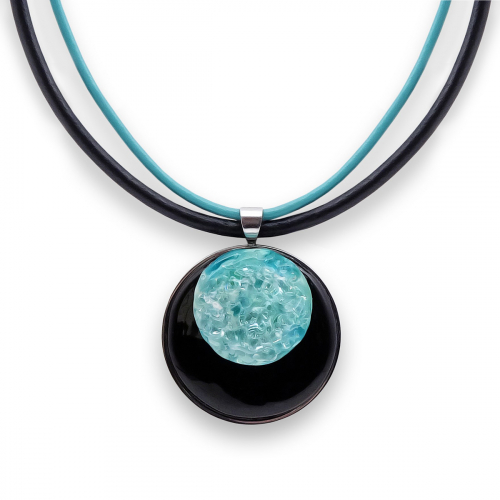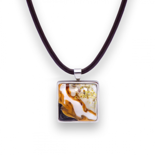 Колье изготовлено из натуральной кожи, муранского стекла и гипоаллергенной ювелирной стали, что очень важно для людей с чувствительной кожей. Металл не темнеет и не подвергается воздействиям окружающей среды, надолго обеспечивая красивый внешний вид изделия. Длина колье - 46 см + 5 см. удлиняющая цепочка. Размер стеклянного элемента - 2,2х2,2 см.  Вес - 19  гр.