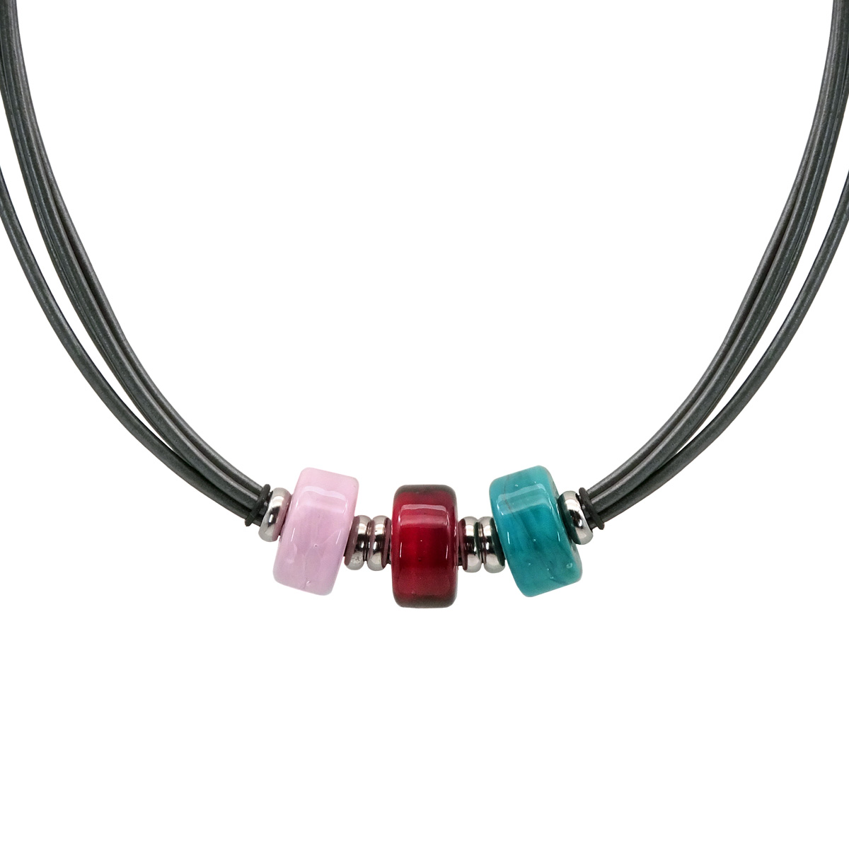 Колье изготовлено из натуральной кожи, муранского стекла и гипоаллергенной ювелирной стали, что очень важно для людей с чувствительной кожей. Металл не темнеет и не подвергается воздействиям окружающей среды, надолго обеспечивая красивый внешний вид изделия. Длина колье - 43 см + 5 см. удлиняющая цепочка. Размер стеклянных ронделей - 0,7*1,5 см. Вес - 23 гр.