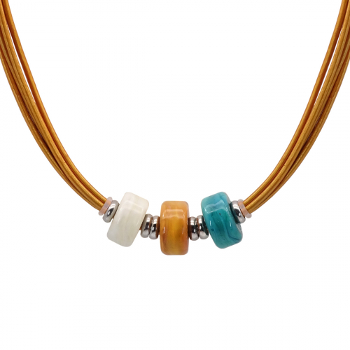 Колье изготовлено из натуральной кожи, муранского стекла и гипоаллергенной ювелирной стали, что очень важно для людей с чувствительной кожей. Металл не темнеет и не подвергается воздействиям окружающей среды, надолго обеспечивая красивый внешний вид изделия. Длина колье - 43 см + 5 см. удлиняющая цепочка. Размер стеклянных ронделей - 0,7*1,5 см. Вес - 50 гр.