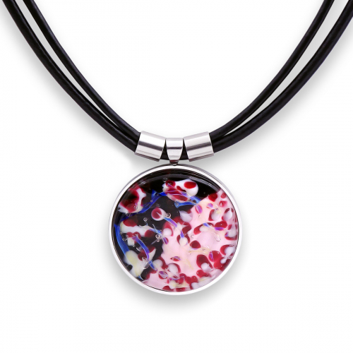 Колье изготовлено из натуральной кожи, муранского стекла и гипоаллергенной ювелирной стали, что очень важно для людей с чувствительной кожей. Металл не темнеет и не подвергается воздействиям окружающей среды, надолго обеспечивая красивый внешний вид изделия. Длина колье - 46 см + 5 см. удлиняющая цепочка. Размер стеклянного элемента - 2,2х2,2 см. Вес - 18 гр.