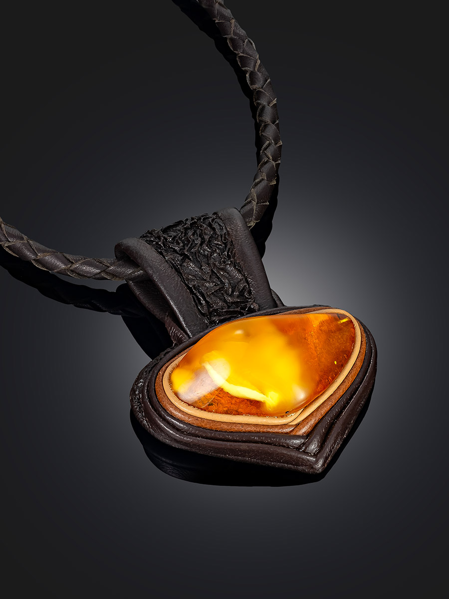 Колье с крупной подвеской из кожи «Амазонка» с живописным полупрозрачным янтарём