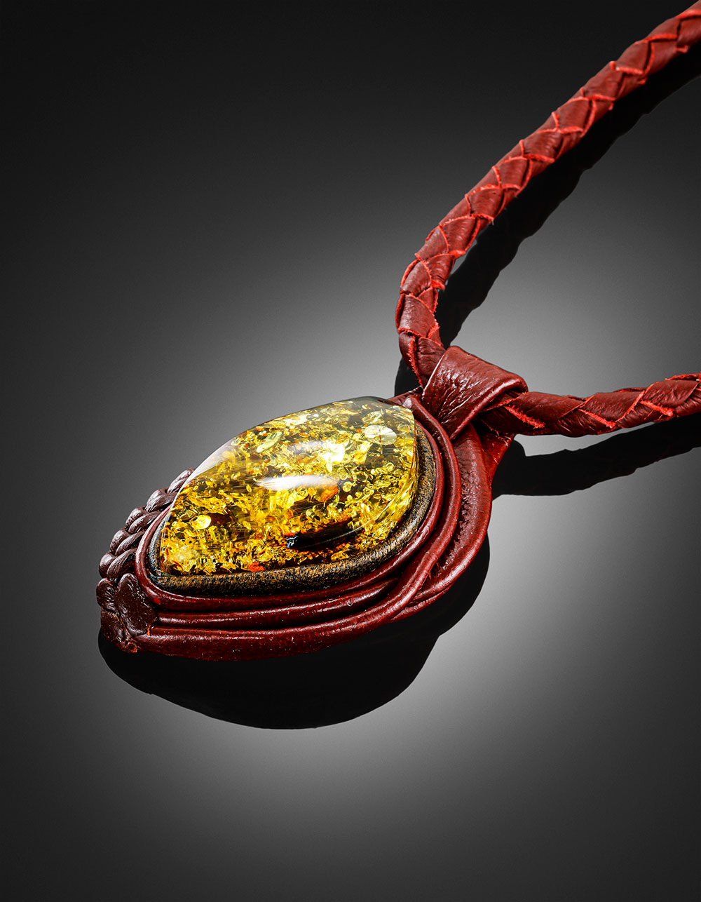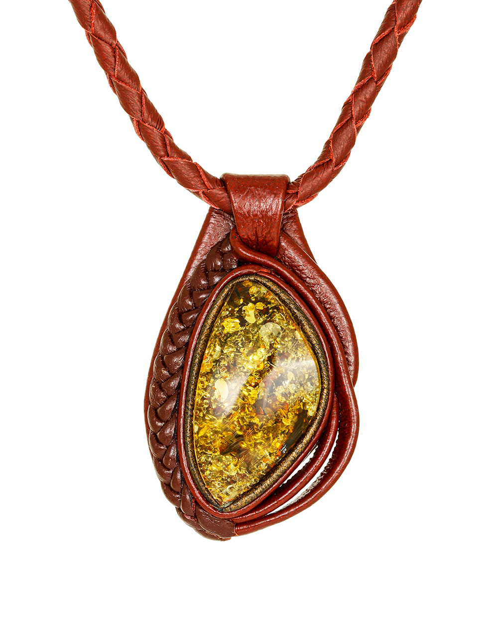 Колье с подвеской из искристого зелёного янтаря и кожи «Амазонка»