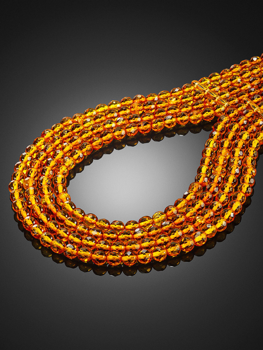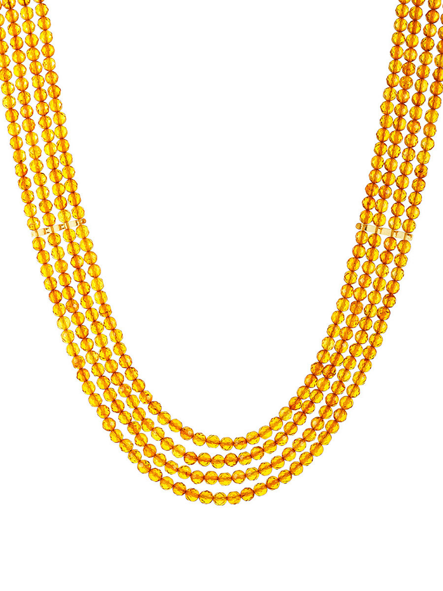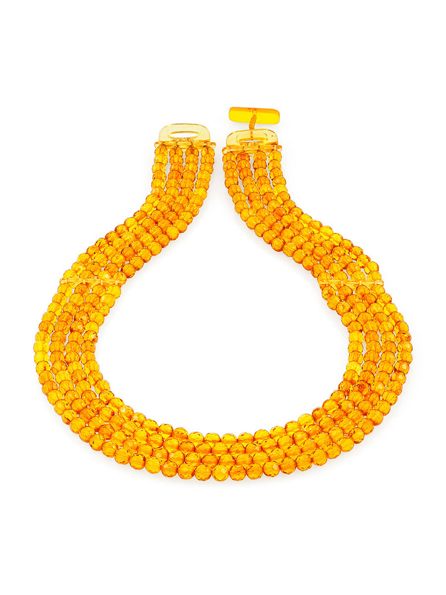 Четыре ряда сверкающих огранёных янтарных бусин — и вы получаете праздник в любой день, без повода и календаря. Яркий солнечный оттенок янтаря красиво подсвечивает кожу и добавляет тепла вашему образу, а яркие блики, отражающиеся от граней, превратят в вечерний наряд даже лаконичную водолазку._x000D_