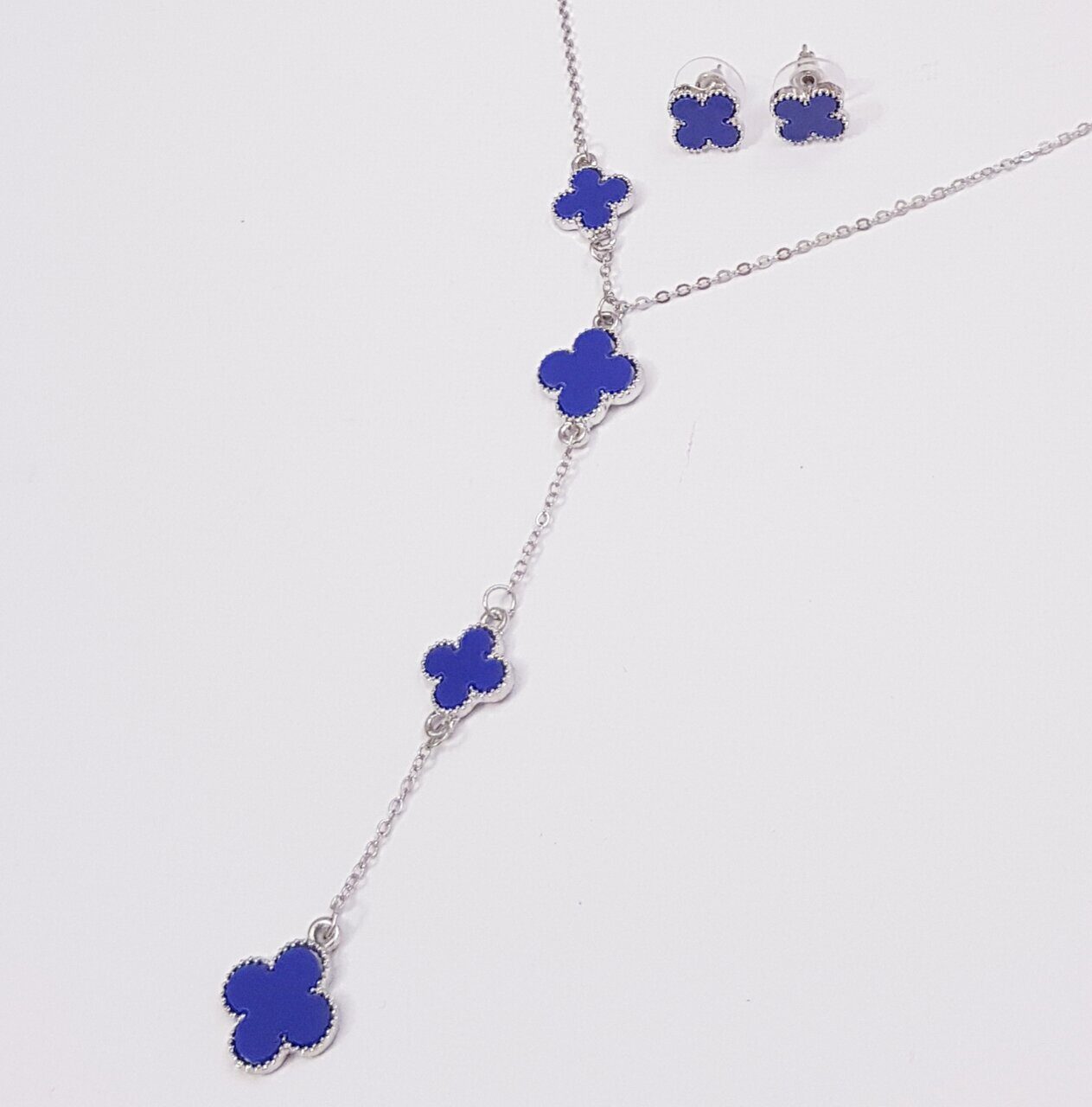 Описание Клевер известен как символ удачи, поэтому комплект пользуется популярностью у женщин. Размер колье: 45*0,2 см. Кулон: 9,5*0,2 см. Размер клевера на кулоне: 1,3 и 1,1 см. Размер серёжек: 1,1*1,1 см. Замок: гвоздики. Материал: металл, пластик. Вес: 14 гр.