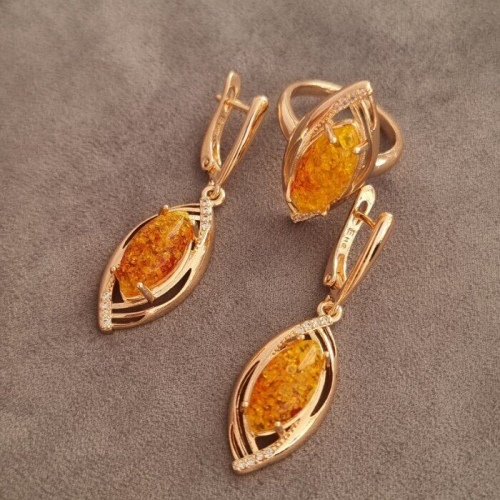 Комплект кольцо и серьги янтарь, покрытие позолота, коллекция "Дубайское Золото", Уценка, арт. 08.1583