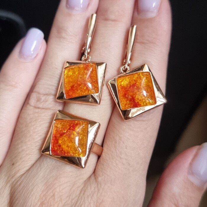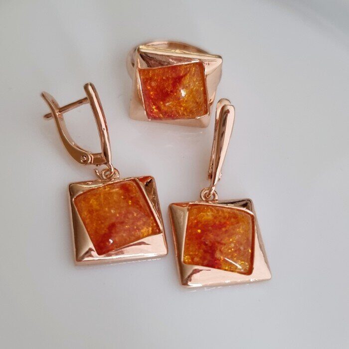 Комплект кольцо и серьги янтарные, покрытие позолота, коллекция "Дубайское Золото", Уценка, арт. 08.2015