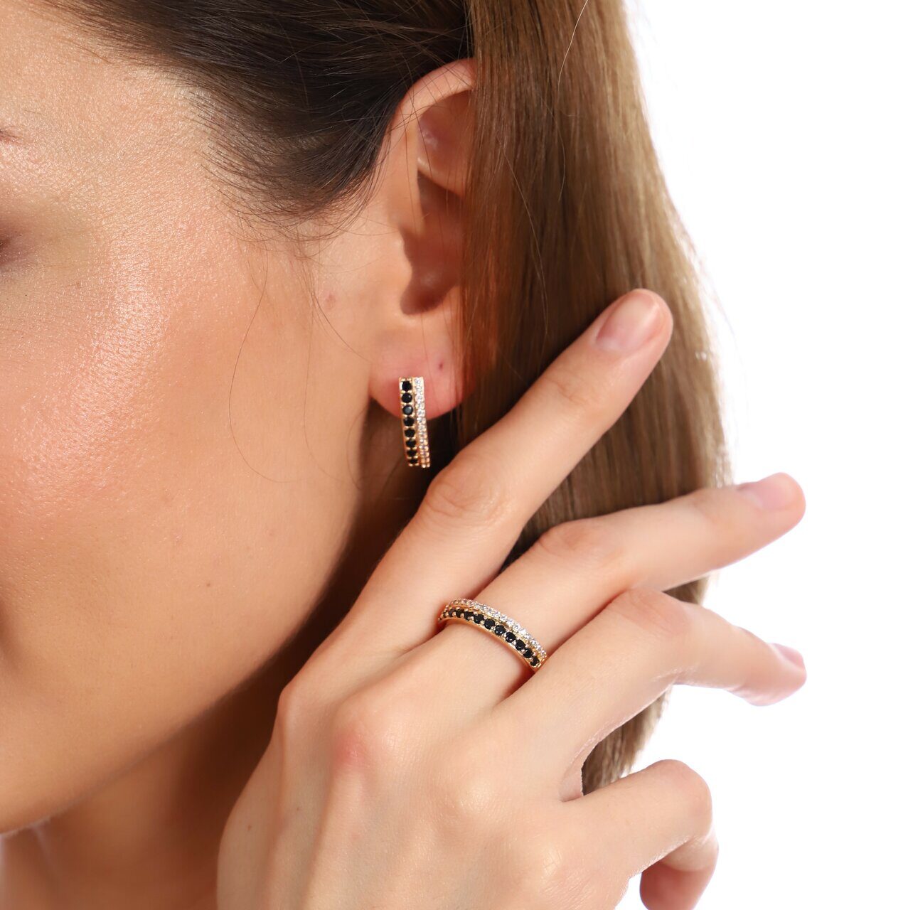 Комплект коллекция "Дубай", покрытие позолота с камнем, цвет черный, серьги, кольцо р-р 17, Е7224, арт.747.755