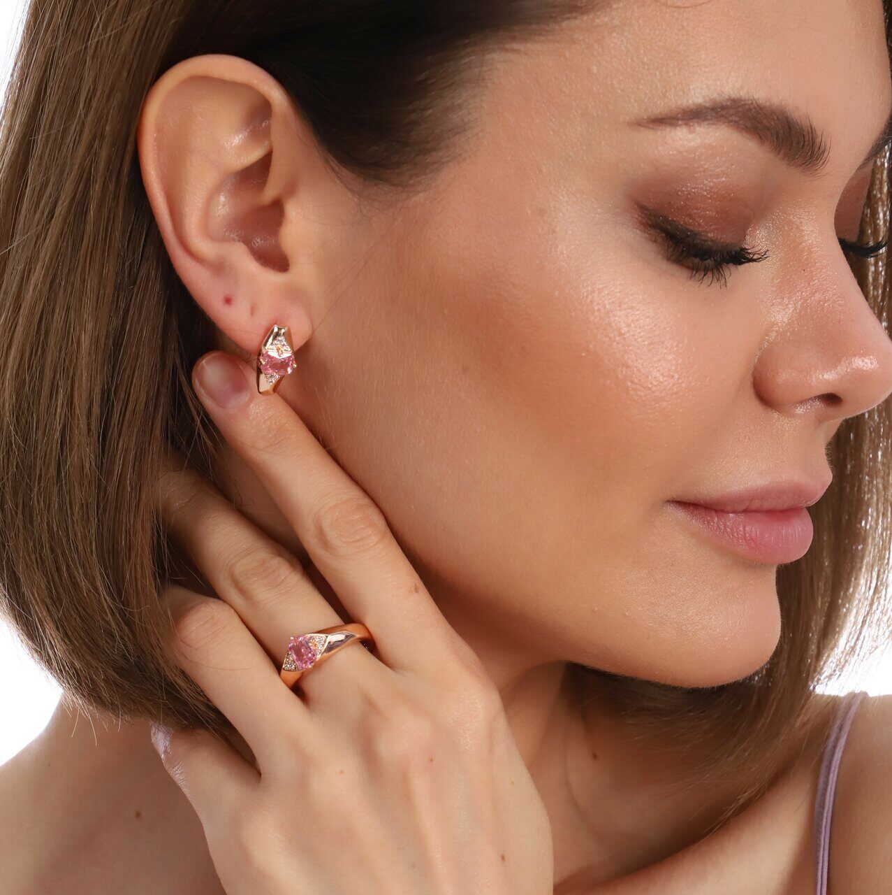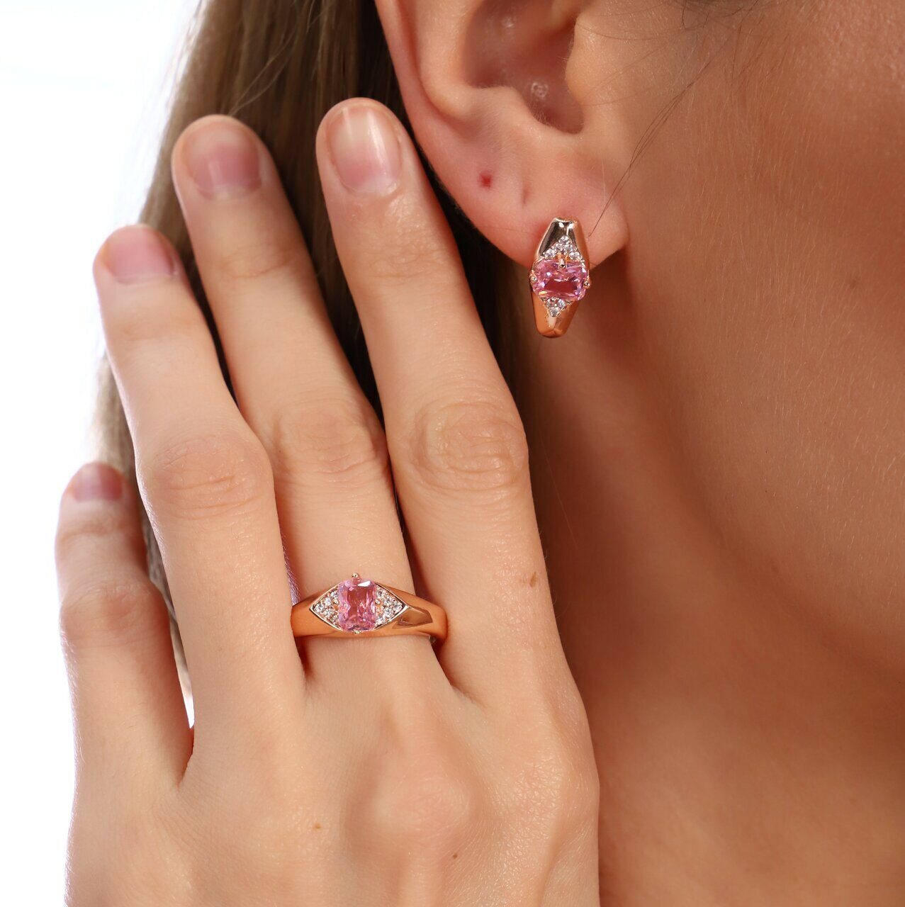 Комплект коллекция "Дубай", покрытие позолота с камнем, цвет розовый, серьги, кольцо р-р 19, Е6167, арт.747.727