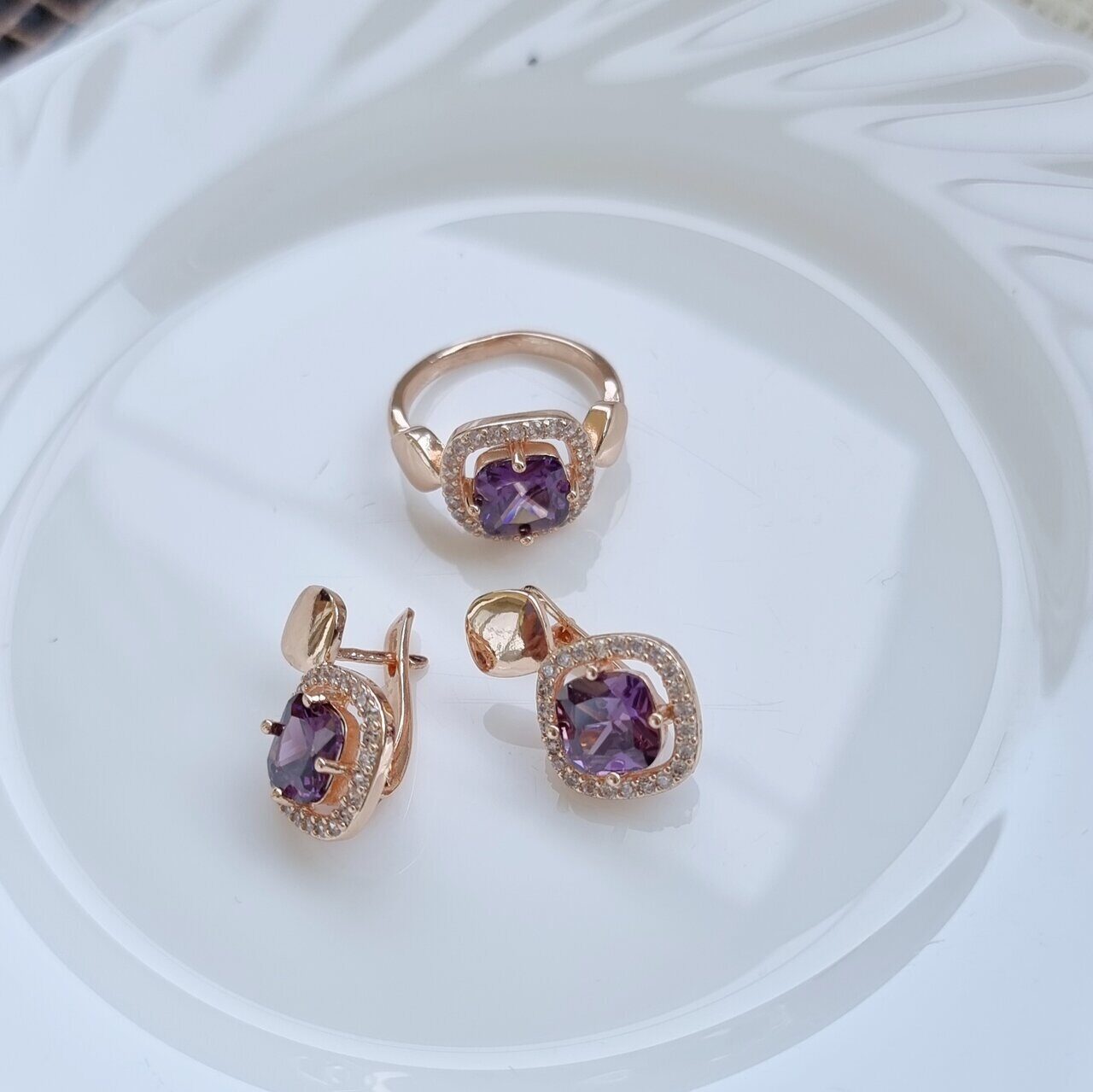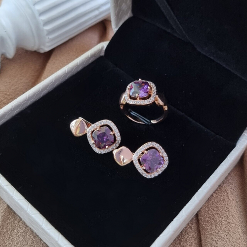 Комплект коллекция "Дубай", покрытие позолота с фианитами, цвет фиолетовый,серьги, кольцо р-р 17 , А122208, арт.747.338