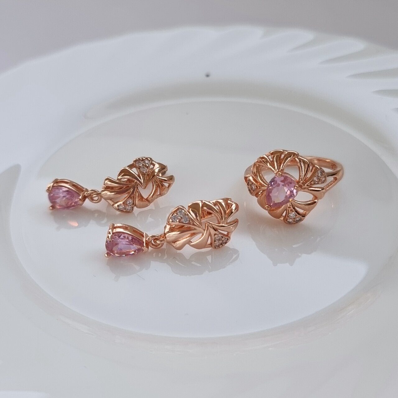 Комплект коллекция "Дубай", покрытие позолота с камнем, цвет розовый, серьги, кольцо р-р 18, А801807, арт.747.418