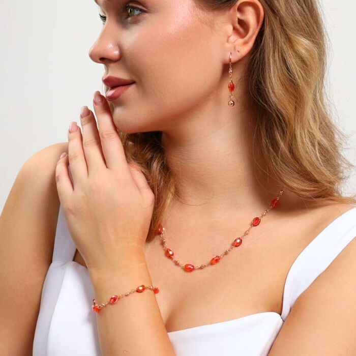 Комплект: ожерелье, серьги и браслет, покрытие: дубайское золото, цвет камней: красный, 45123, арт.314.496