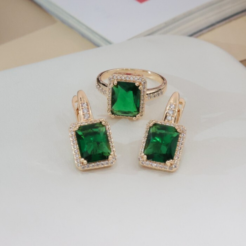 Комплект украшений ювелирная бижутерия Дубайское золото серьги и кольцо 18 р, покрытие позолота, вставка: фианит, цвет: прозрачный и зеленый, Уценка, арт.08.2559