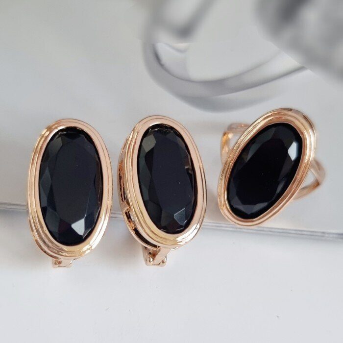 Комплект украшений ювелирная бижутерия Дубайское золото серьги и кольцо, покрытие позолота, вставка: камень, цвет: черный, р р 19, Уценка, арт.08.1799