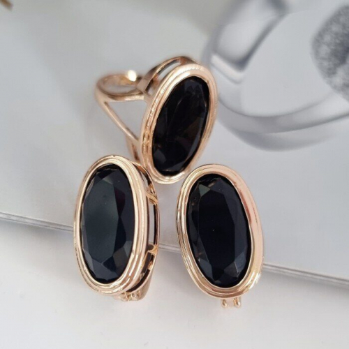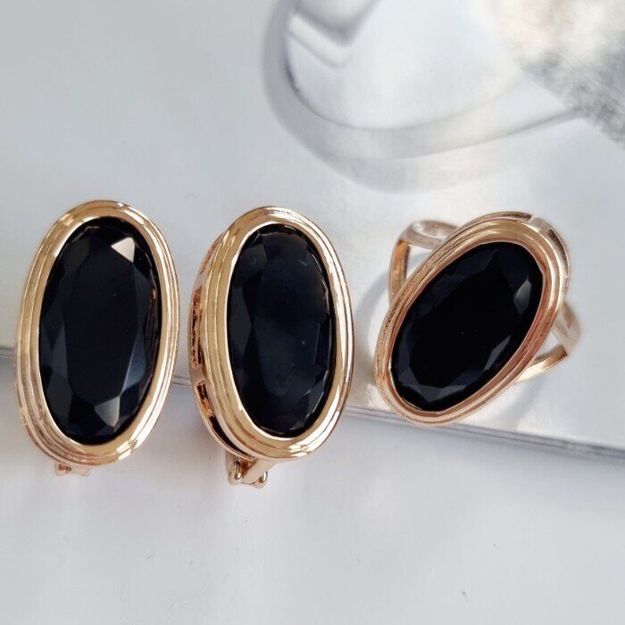 Комплект украшений ювелирная бижутерия Дубайское золото серьги и кольцо, покрытие позолота, вставка: камень, цвет: черный, р р 18, Уценка, арт.08.2401
