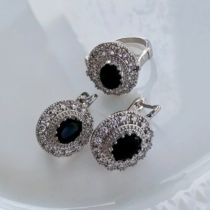 Комплект украшений ювелирной бижутерии р-р 17,5 с покрытием посеребрение, вставка: черный камень, 0970, арт.216.017-17,5