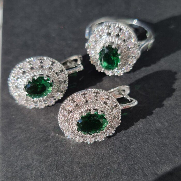 Комплект украшений ювелирной бижутерии р-р 19 с покрытием посеребрение, вставка: зеленый камень, 0970, арт.216.019-19