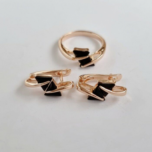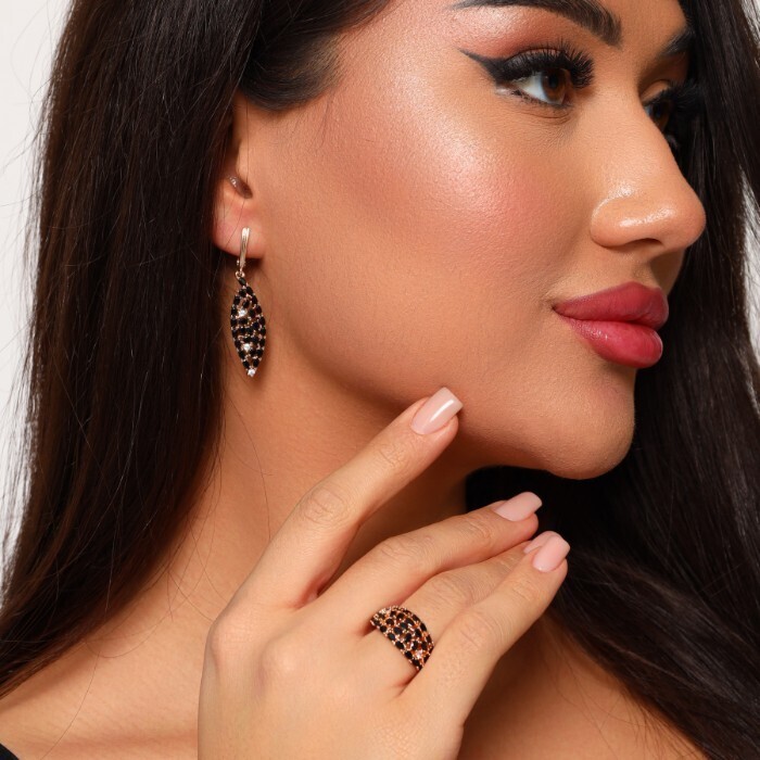 Комплект ювелирная бижутерия коллекция "Дубай" серьги и кольцо 19 р, покрытие: позолота 18К, вставка: фианиты, цвет: черный,Уценка, арт.08.2244