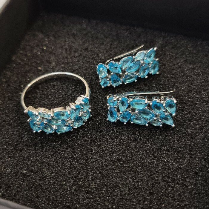 Комплект ювелирная бижутерия, серьги и кольцо посеребрение, голубые камни, р-р 20, 542809 арт.847.772