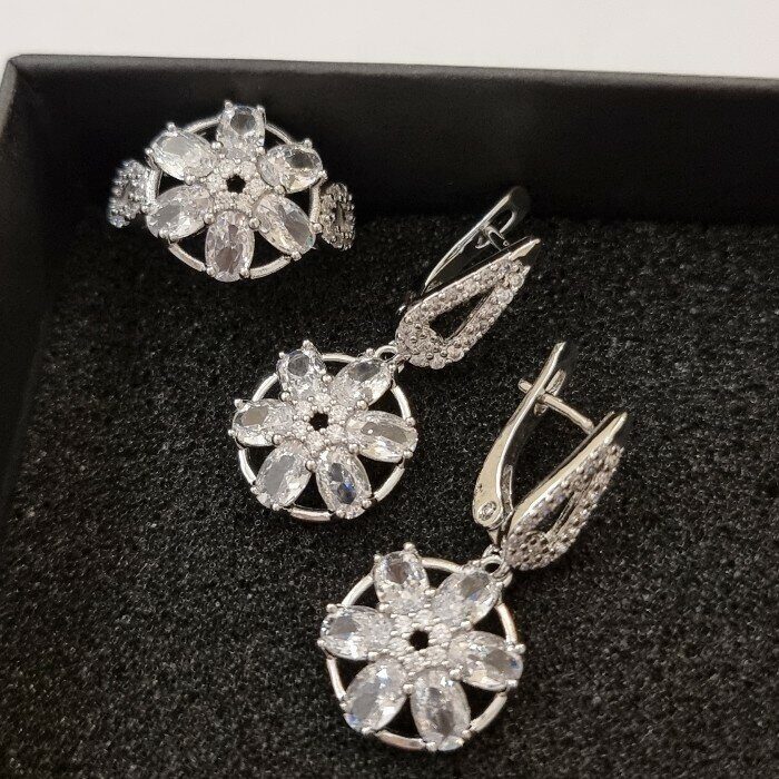 Комплект ювелирная бижутерия, серьги и кольцо посеребрение, камни бело-прозрачного цвета, р-р 17, 542809 арт.847.831