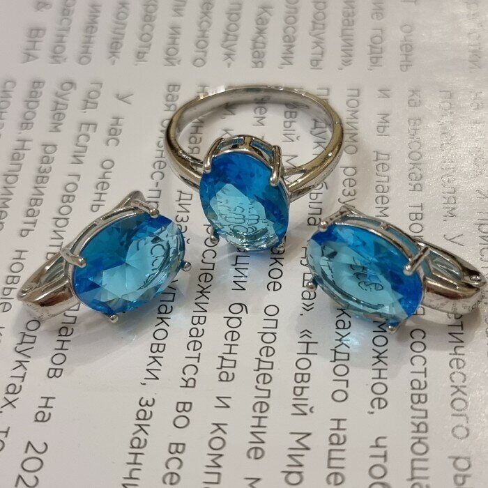 Комплект ювелирная бижутерия, серьги и кольцо посеребрение, камни цвет голубой, р-р 20, 54168, арт.847.945