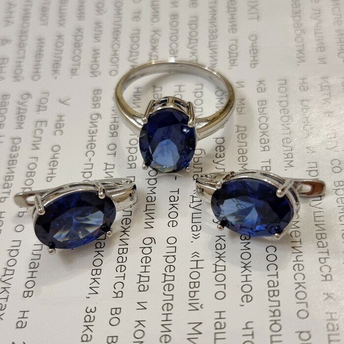 Комплект ювелирная бижутерия, серьги и кольцо посеребрение, камни цвет синий, р-р 17, 54168, арт.847.951