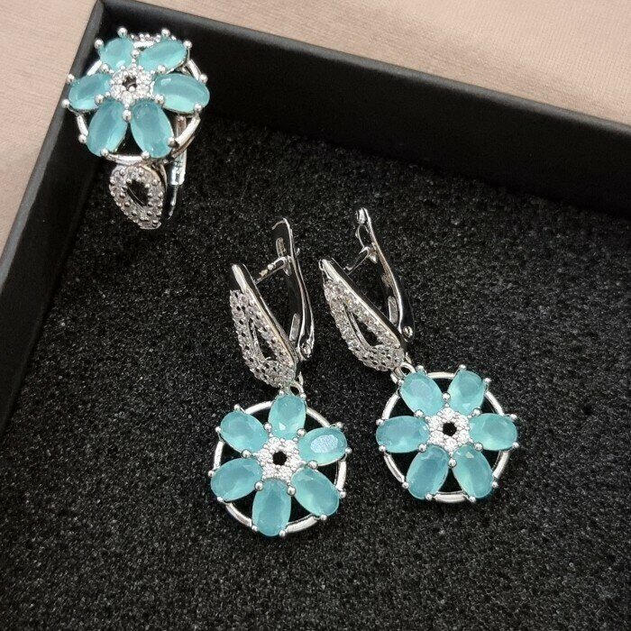 Комплект ювелирная бижутерия, серьги и кольцо посеребрение, камни цвета тиффани, р-р 19, 542809 арт.847.811