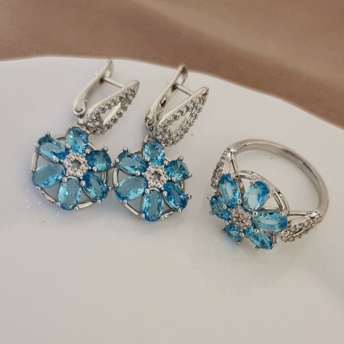 Комплект ювелирная бижутерия, серьги и кольцо посеребрение, камни голубого цвета, р-р 17, 542809 арт.847.804