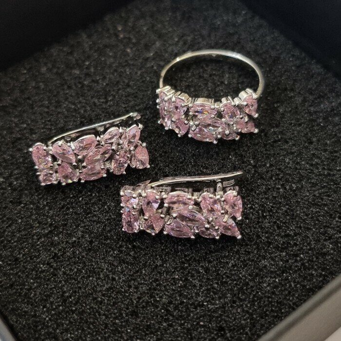 Комплект ювелирная бижутерия, серьги и кольцо посеребрение, прозрачно-розовые камни, р-р 18, 542809 арт.847.756