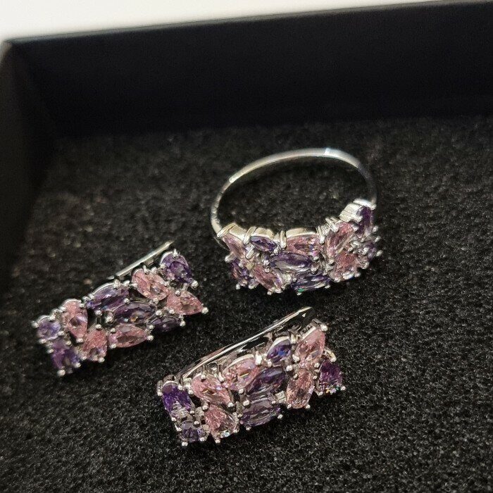 Комплект ювелирная бижутерия, серьги и кольцо посеребрение, розово-фиолетовые камни, р-р 18, 542809 арт.847.774