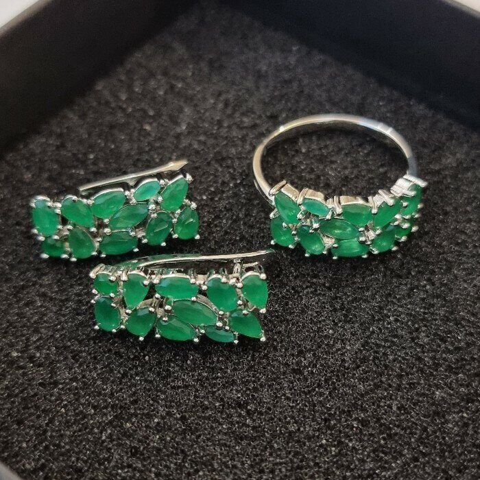 Комплект ювелирная бижутерия, серьги и кольцо посеребрение, зеленые камни, р-р 18, 542809 арт.847.747