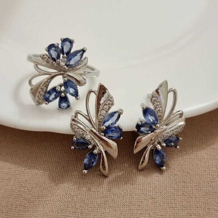Комплект ювелирная бижутерия, серьги и кольцо посеребрение, камни цвет синий, р-р 17, 76168, Уценка, арт.08.1618