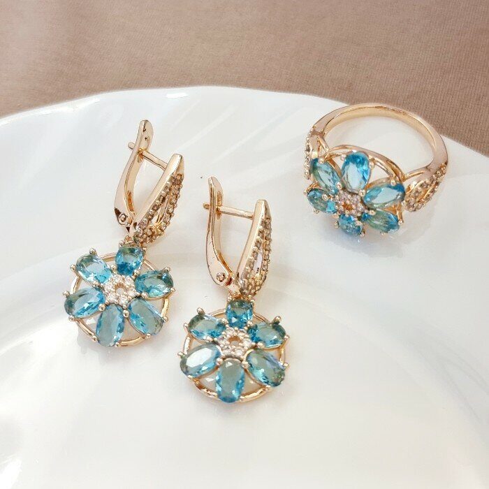 Комплект ювелирная бижутерия, серьги и кольцо позолота, камни голубого цвета, р-р 17, 542809 арт.847.791